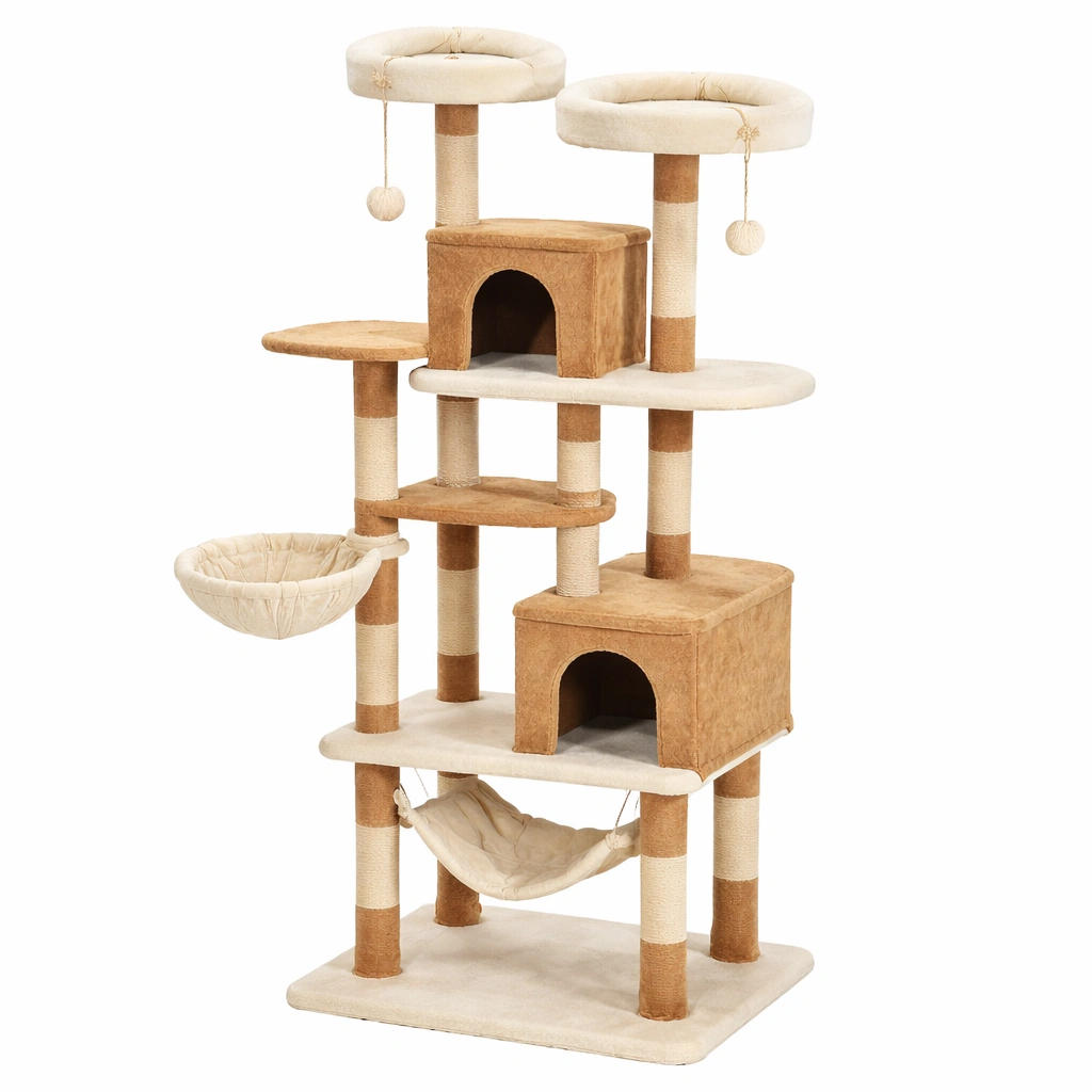 Contiene rascadores, zonas de descanso y juego con postes, casitas, hamaca y plataformas.